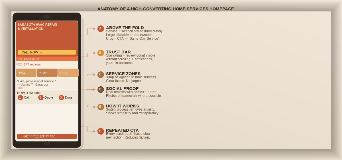 This sounds absurdly basic, but it's one of the most common issues. Homeowners searching for an emergency plumber or an AC unit that failed on a July afternoon in Sarasota want to call right now. If your phone number isn't immediately visible — in the top right corner of every page, large and clickable on mobile — you've already lost a percentage of your best leads.